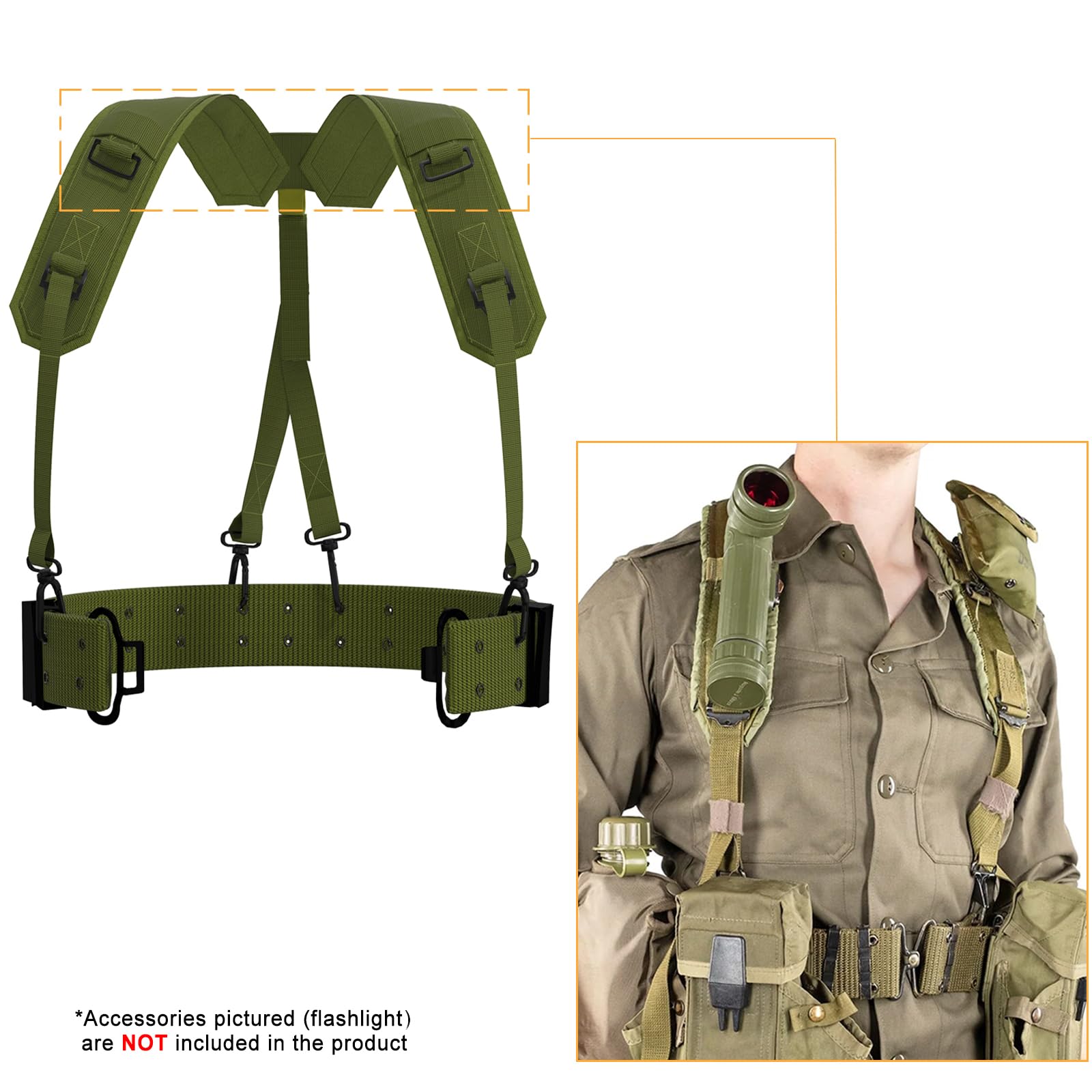- Y-yoke: The Y-yoke system features padded shoulders, a 4 point harness that clips in to the metal loops on an ALICE frame or belt, and has areas to clip a flashlight & other small pouches on to the shoulder.