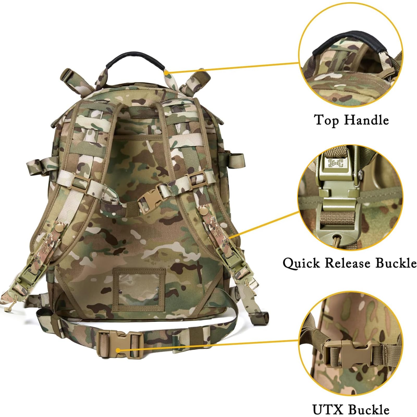 - Bear and Load: It provides 1,525 cubic inches of space in the main compartment and 825 cubic inches of space in the large front packet. It carries 60 pounds and can be easily donned and doffed over the FLC and/or TAP. Four compression straps allow more space extend of MOLLE pouches attachment. User name tag pocket on back.