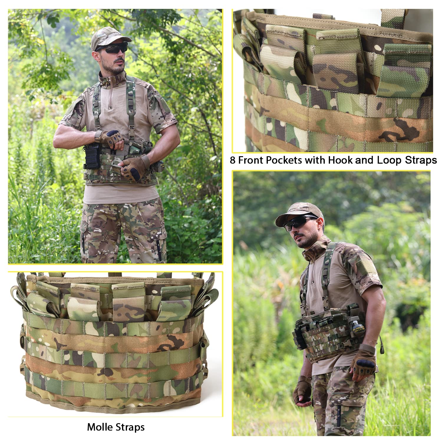 - MT military TAP has 8 front pockets with hook and loop straps are ideal for storing your mag with the end pockets providing extra room to store a GPS, radio, or additional mag. You can attach additional MOLLE (modular lightweight load-carrying equipment) compatible gear to the 3 rows of MOLLE straps on the front panel of the military chest rig.