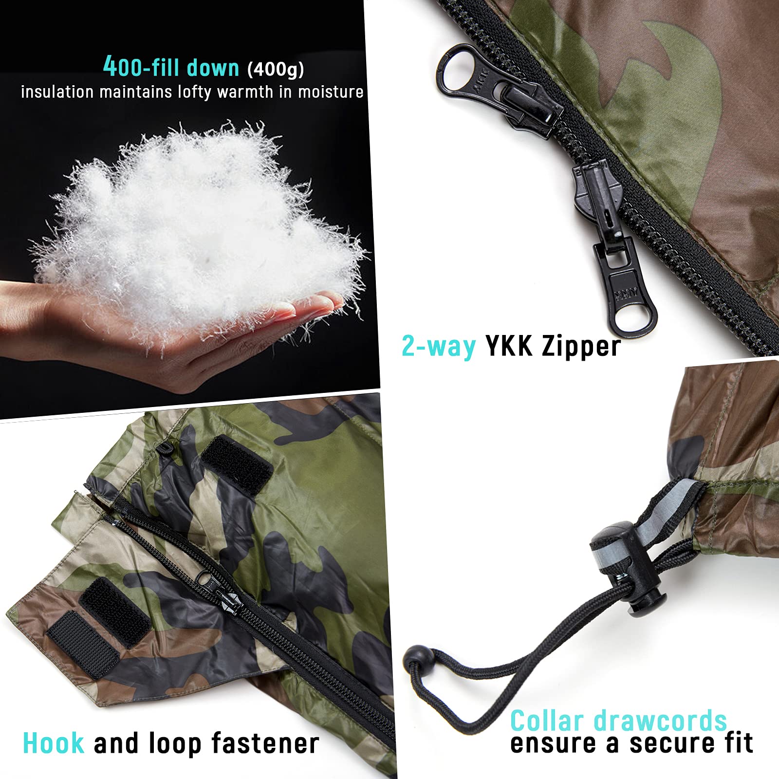 - Design on Your Mind: This bag offers all the ultra-warm, compressible, and featherweight benefits that down is know for. Not only does the rectangular shape offer a spacious feel that you can shift around in, but it also allows you to zip it up to another 400T sleeping bag to make a double sleeping bag, and the bottom of YKK zipper allows you to vent your feet. Even when unzipped completely, one sleeping bag can conveniently cover two people as a light comforter.